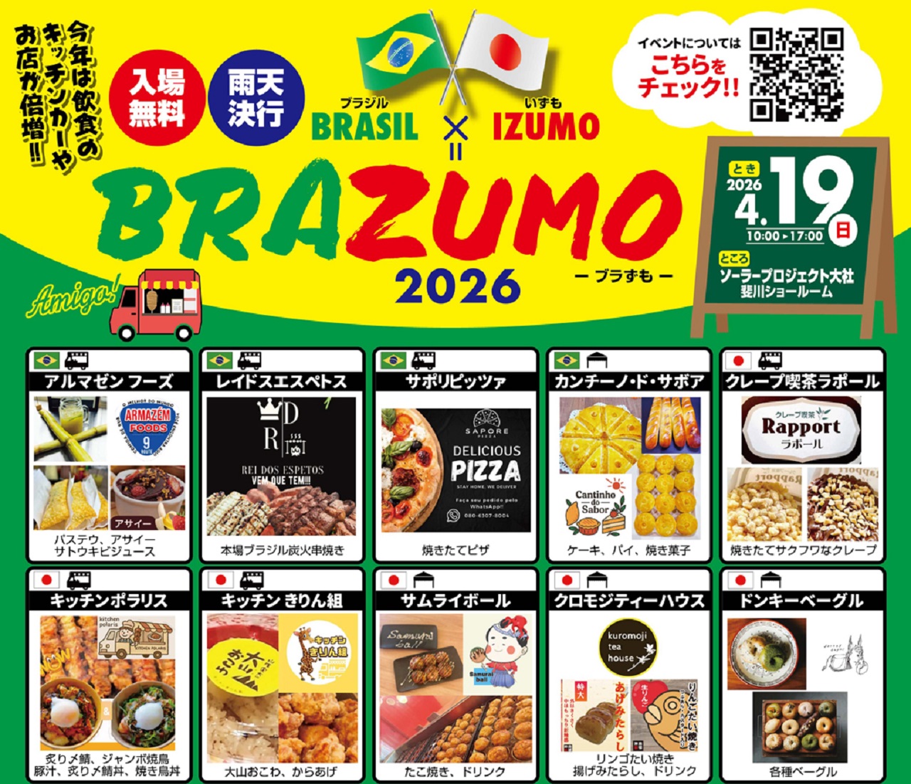 | ざっくり内容 | 出雲市在住のブラジル人と地元住民との交流を目的として、2025年4月に1回目を開催した「BRAZUMO祭り」。 2回目となる今回は、前回の倍以上となる10店舗のキッチンカーや飲食の出店を予定。本場・ブラジルのメニューから日本の「おこわ」や「たこやき」まで、幅広いメニューが登場予定。 |