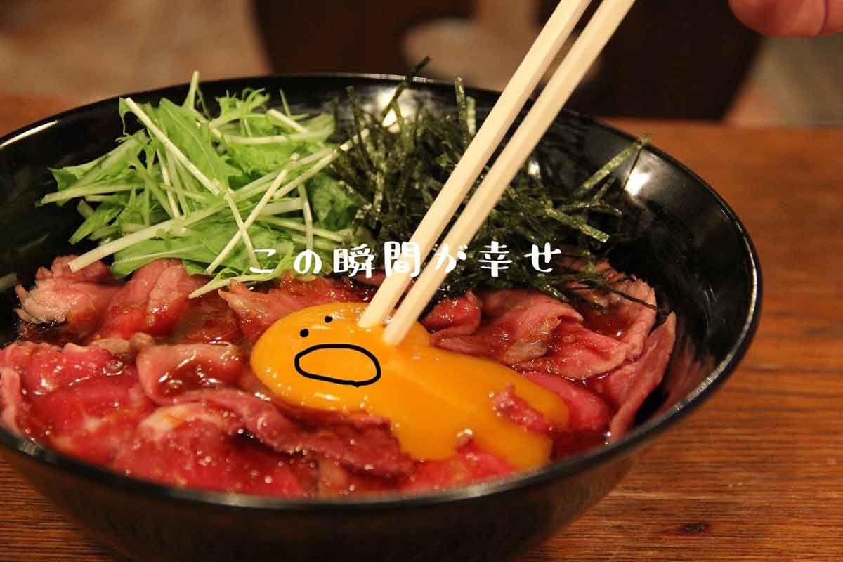 黄身を絡める幸せな瞬間も楽しんでください。オーブンでじっくり焼き上げたローストビーフは柔らかく、醤油ベースの甘口タレがとっても合う~!