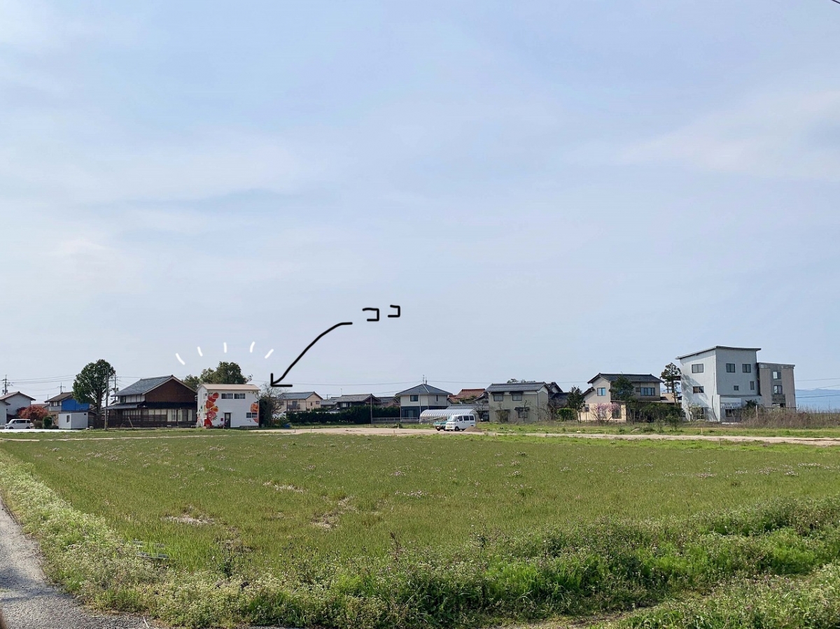 国道9号線を東に走り、赤江の信号を左折。すると目の前の景色が一気に“田園風景”に! 国道からのこの景色には驚きました。すると、田んぼには似合わないちょっぴり派手な建物が……。
