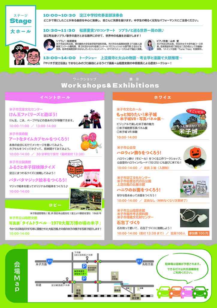 ステージイベントは、米子市淀江町出身のソプラノ松原愛実さんによるソロコンサート、淀江中学校吹奏楽部演奏会、上淀廃寺と大山にまつわる歴史トークショーの3本立て。特設ブースは、けん玉体験をはじめ、ワークショップ(ハニワのお面、石包丁、タイムカプセル、ハロウィン飾り、マジック絵本)、恒例の米子城VR体験など盛りだくさん。さらに今回は、大阪万博が開催された1970年頃の米子の風景へタイムトラベルできる写真展も。