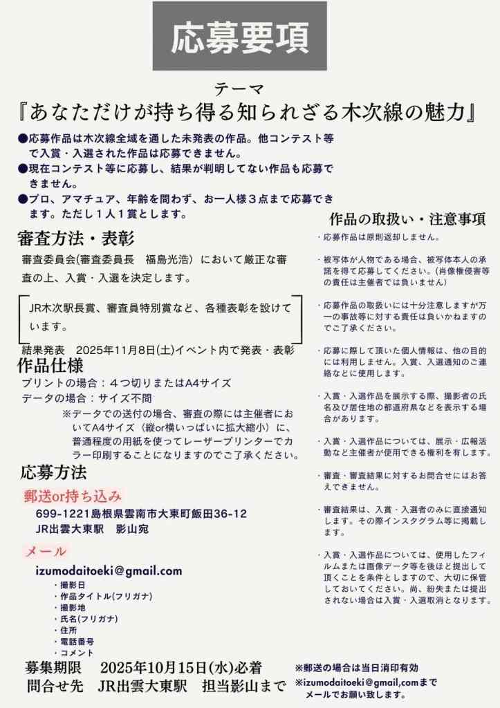 JR出雲大東駅では、「あなただけが持ち得る知られざる木次線の魅力」をテーマにフォトコンテストを実施中。