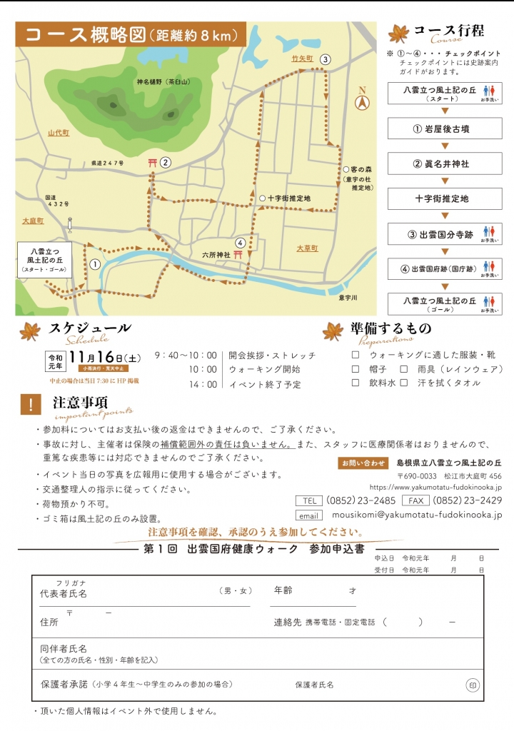 国引き神話の原点である意宇平野を歩き、この地に広がる遺跡や文化財を巡るウォーキングイベント。約8kmのコースにあるチェックポイントでは、遺跡の詳しい解説やクイズを実施。すべてのクイズ正解者にはプレゼントもあり。参加者にはウォーキング後にしじみの味噌汁や大庭の「かんなび米」のおにぎりが振る舞われる。