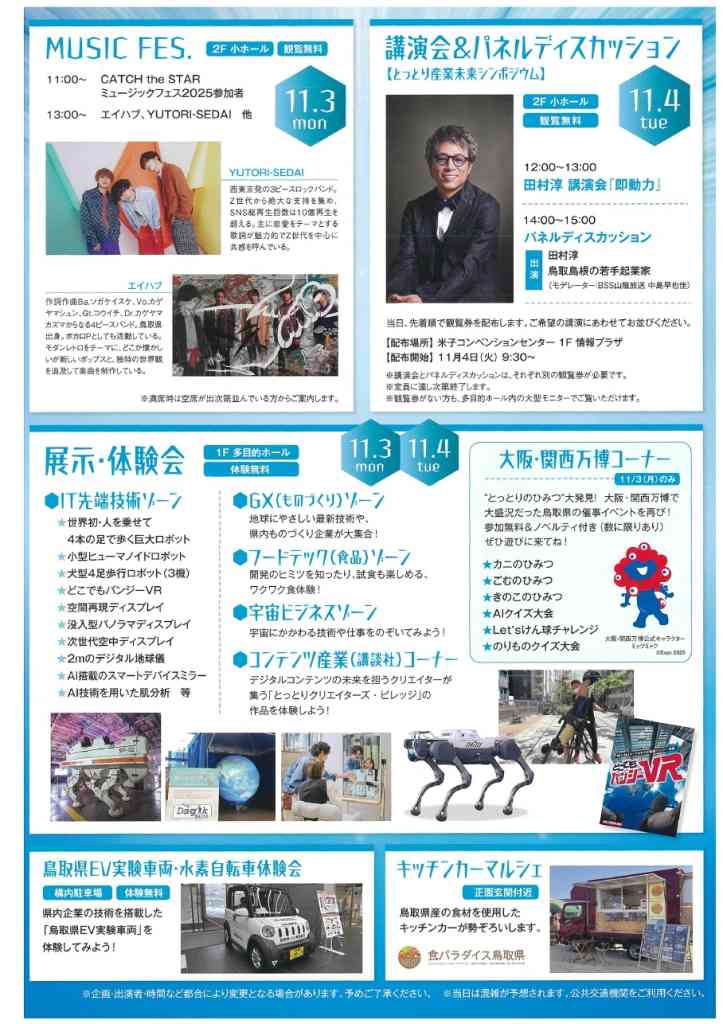 また、YUTORI-SEDAI、エイハブが出演する「MUSIC FES.」(3日のみ)や、田村淳さんを迎えての「講演会&パネルディスカッション」(4日のみ)、大阪・関西万博で大盛況だった鳥取県のブースが登場(3日のみ)するなど、内容盛りだくさん。