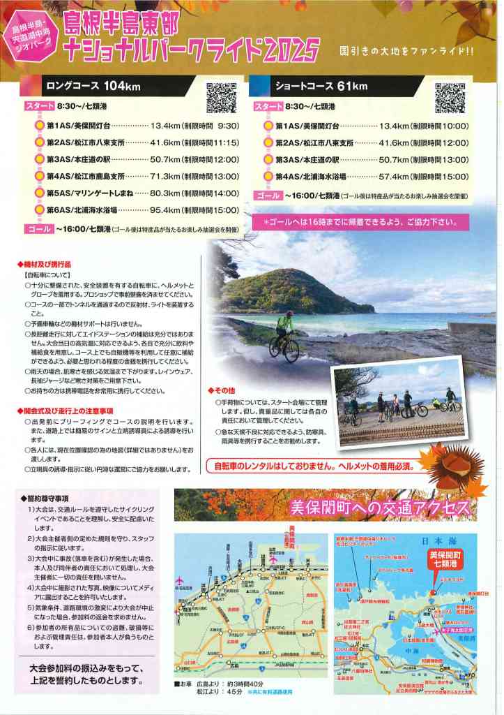絶景の日本海、中海を巡りながらご当地地産グルメを堪能する約104km(65km)のサイクリングだ。