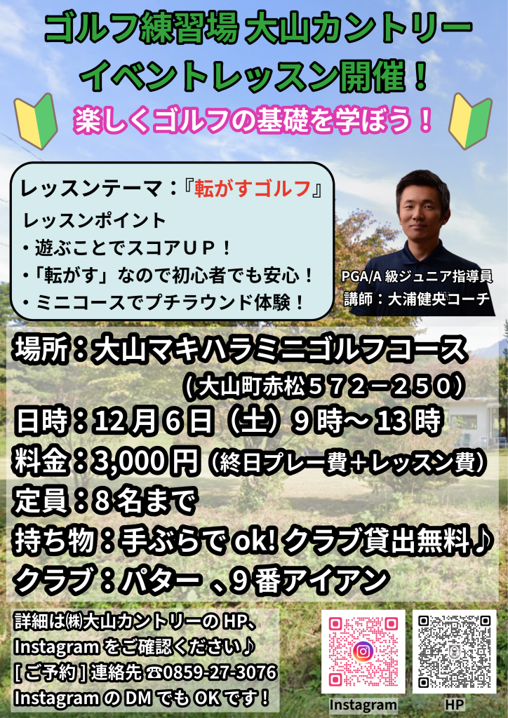 | 料金 | 参加3000円(終日プレー費1000円+レッスン費2000円)※要事前申込 |