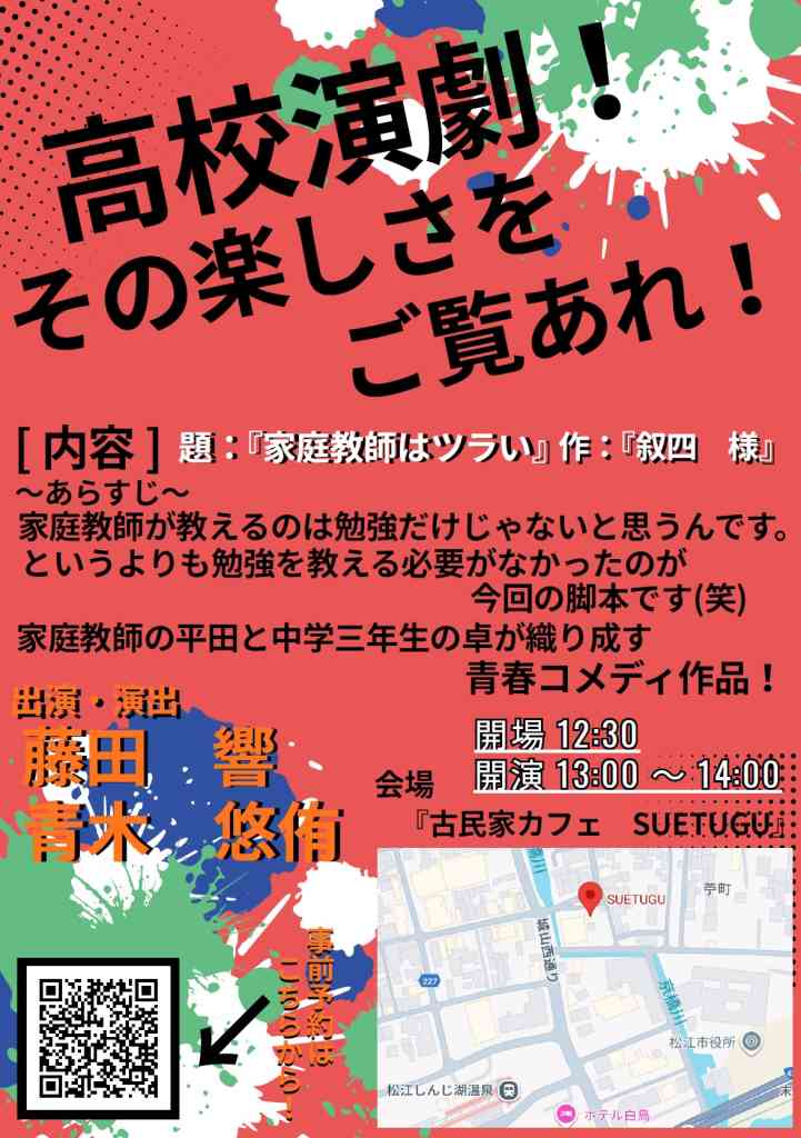 松江商業高校演劇部が織りなす二人劇。叙四氏の作「家庭教師はツラい」で高校演劇の楽しさをご覧あれ!