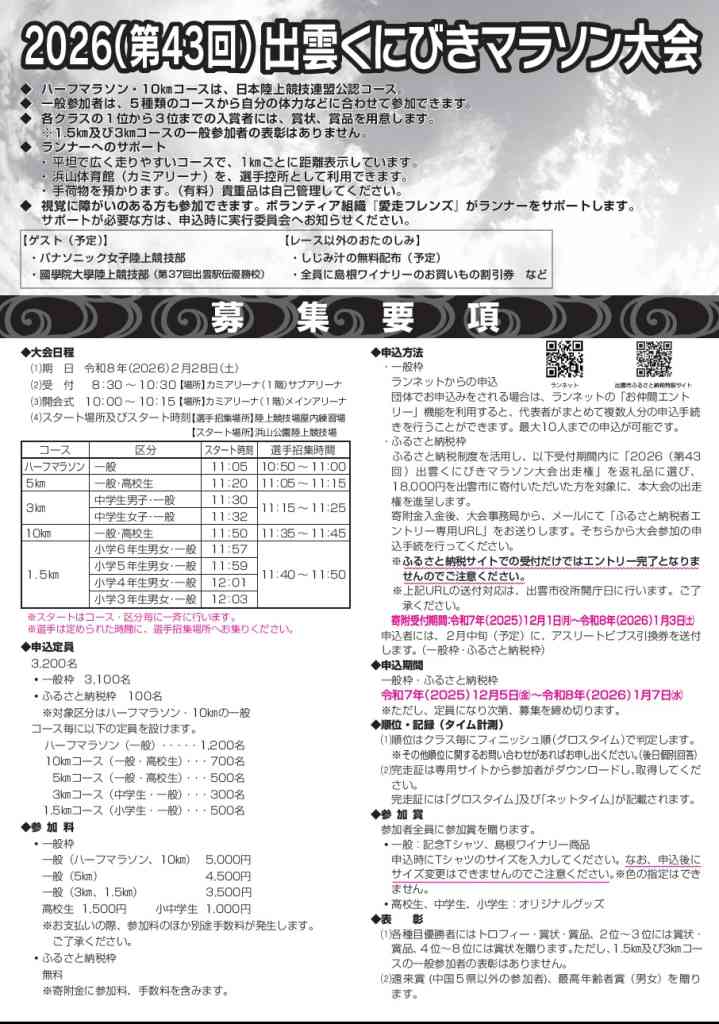 「2026(第43回)出雲くにびきマラソン大会」の参加者を募集。
