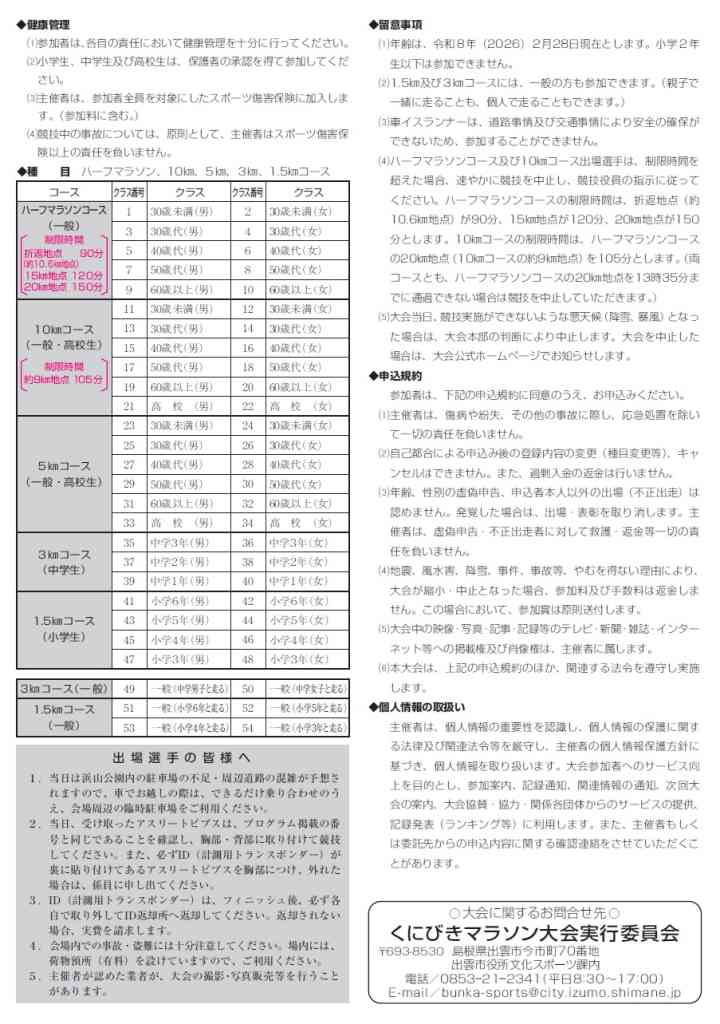| お問い合わせ | くにびきマラソン大会実行委員会事務局(出雲市役所文化スポーツ課内) |