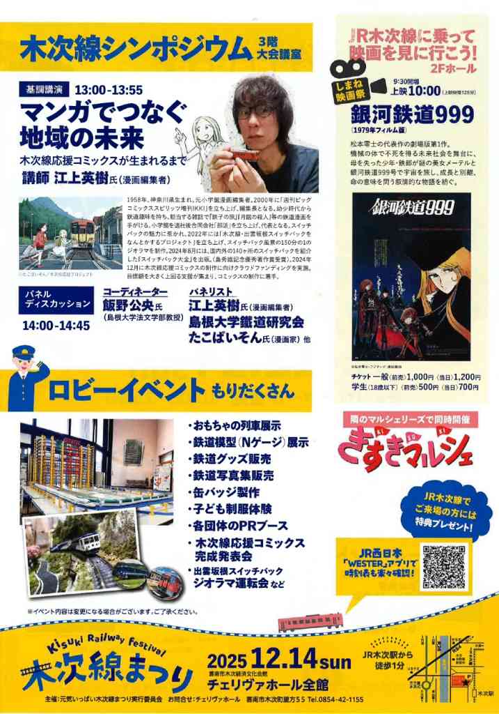 | 日程 | 【木次線まつり】12月14日(日)10:00~15:00【しまね映画祭】12月13日(土)10:30~12:04、14:00~15:34、12月14日(日)10:00~12:08 |