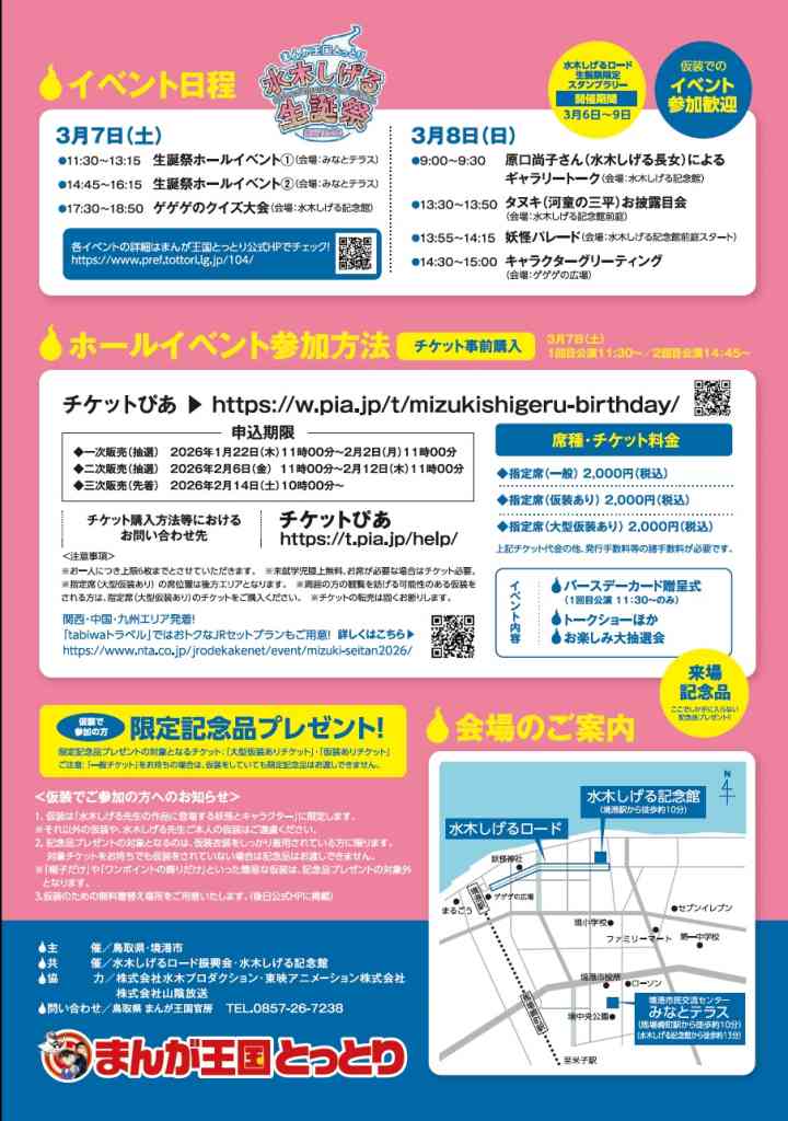 | 備考 | その他:ホールイベントはウェブサイト(https://w.pia.jp/t/mizukishigeru-birthday/)より要事前申込*【一次販売(抽選)】1/22(木)11:00~2/2(月)11:00【二次販売(抽選)】2/6(金)11:00~2/12(木)11:00【三次販売(先着)】2/14(土)10:00~ |