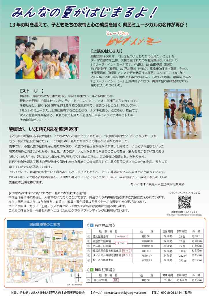 島根県が2000年に公募した脚本を元に、故・山田卓氏、故・岩谷時子氏、故・宮川泰氏ら日本を代表する豪華製作陣によって誕生したミュージカル「ビリーブ・イン・ミー」。2001年から計3回上演されたが、その後県の事業としては終了。しかし、再演を望む多くの声を受け、今回再び上演されることとなった。